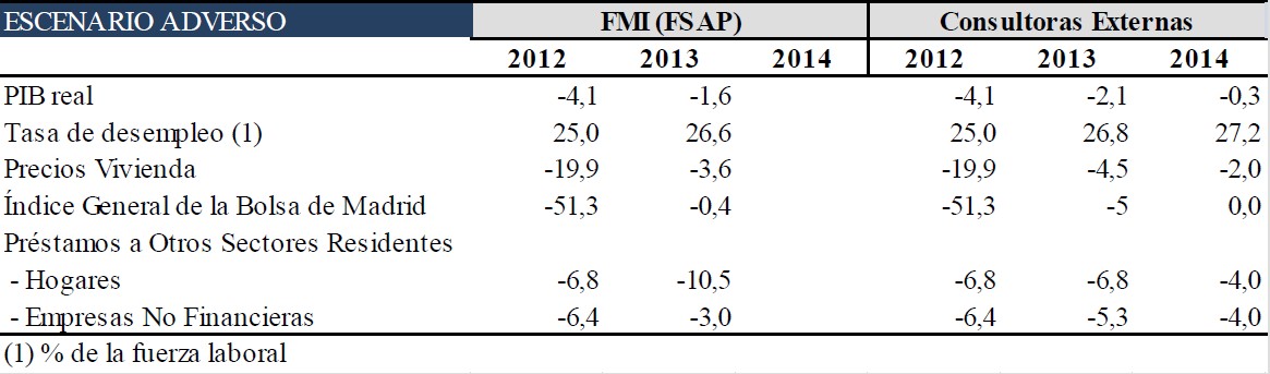 Escenario adverso: el Gobierno asegura que no hay más de un 1% de posibilidades de llegar a esta situación pero, pese a todo, ha querido incluir esta hipótesis en el análisis de las consultoras. Supondría una caída del PIB del 4,1% este año, con un paro del 27% en 2014 y un desplome en los precios de la vivienda respecto a los de 2007 del 55-60% y una caída del suelo de hasta el 90%. Con todo eso, y sería mucho, el sistema financiero necesitaría entre 51.000 y 62.000 millones de euros según Oliver Wyman y de unos 51.800 millones para Roland Berger. Hay que tener en cuenta que estas cantidades son las que no podría generar el sistema por sí mismo en los próximos tres años.