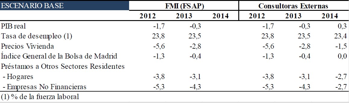 Escenario base: incluye unas previsiones similares a las del Gobierno (ver tabla). Una caída del PIB en 2012 del 1,7%, una tasa de paro del 23,8 a final del año y un desplome de los precios de la vivienda del 9% acumulado en los próximos tres años. En esta situación, los requisitos de core capital de la banca serían del 9%. Pues bien, Oliver Wyman cree que para conseguirlo necesitarían entre 16.000 y 25.000 millones; mientras que Roland Berger calcula que serían unos 25.800 millones.