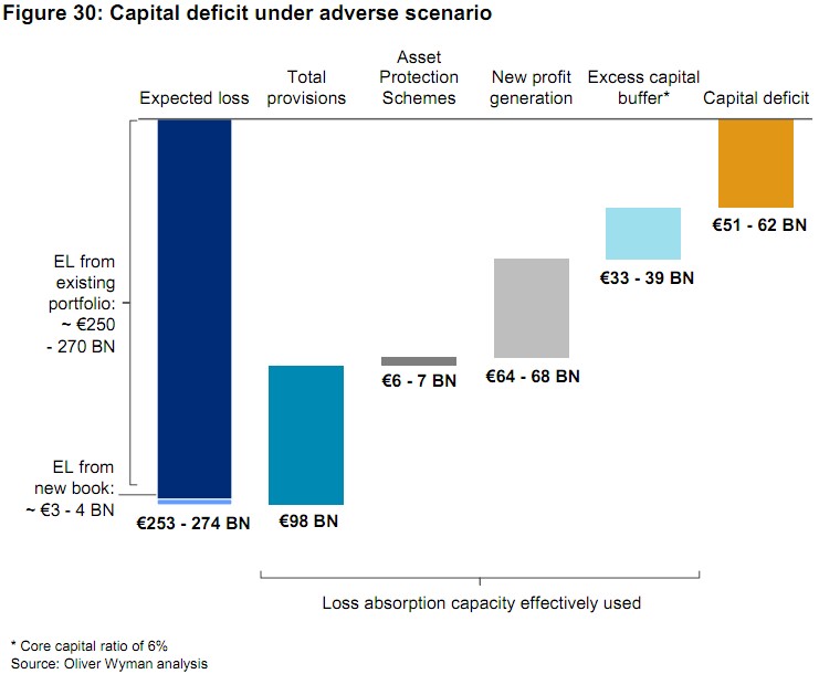 Bajo estos supuestos, la banca nacional acumularía unas pérdidas de hasta 274.000 millones de euros, un escenario próximo al que sufrió el sistema financiero irlandés tras el estallido de su particular burbuja inmobiliaria.