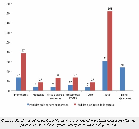 Las auditorías independientes sobre la solvencia de la banca española realizadas por Oliver Wyman y Roland Berger aún arrojan dudas entre los inversores internacionales. Tomando como referencia el informe de Wyman, en el peor de los escenarios estimados (stress test adverso), el sector financiero español presentaría unas necesidades de capital de 62.000 millones de euros. Ésta es la cifra que ha empleado como referencia la mayoría de analistas.