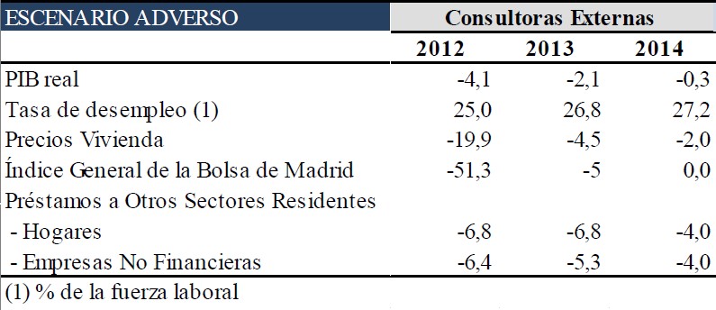 Es importante recordar que estos ejercicios son meras suposiciones de unos expertos que dan su respuesta a la pregunta del anterior epígrafe (quizás otros expertos habrían contestado de otra manera). Se llaman "stress tests" porque ponen los balances de las entidades a prueba en una situación muy adversa. Se supone que los bancos españoles podrían superar, con más o menos dificultades, una situación de normalidad, pero hay muchas más dudas para los casos de tensión extrema en la economía. Eso sí, el Gobierno asegura que no hay más de un 1% de posibilidades de llegar a esta situación que supondría una caída del PIB del 4,1% este año, con un paro del 27% en 2014 y un desplome en los precios de la vivienda respecto a los de 2007 del 55-60% y una caída del suelo de hasta el 90% (ver tabla).