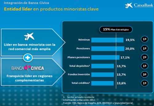El consejero delegado de CaixaBank, Juan Maria Nin, ha señalado que Banca Cívica representa “alrededor del 25% de nuestro balance, cuenta con una fuerte presencia en regiones complementarias a las de “la Caixa” y aporta 3 millones de clientes”. Con lo que Banca Cívica, ha sintetizado Juan María Nin, “nos da una buena plataforma para, de manera inorgánica, crecer y desarrollar nuestro proyecto y anticipar una parte de los hitos marcados en nuestro Plan Estratégico 2011-2014”.
