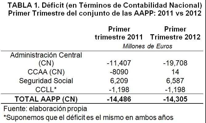 Como resultado, mientras que el déficit del conjunto del sector público español ascendía a -14.486 millones de euros en el primer trimestre de 2011, se sitúa en -14.305 millones en el primer trimestre de 2012.
