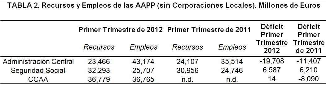 Así pues, se observa cómo "el aumento del déficit de la Administración Central es compensado por la reducción del déficit de las CCAA, quedando la cifra de déficit total prácticamente idéntica a la del anterior ejercicio". Además, "ante los fuertes problemas de liquidez, el Gobierno ha adelantado pagos a las otras administraciones públicas, de modo que a lo largo del ejercicio, en principio, se irá reduciendo el déficit de la Administración Central aumentando paralelamente el de las otras Administraciones.