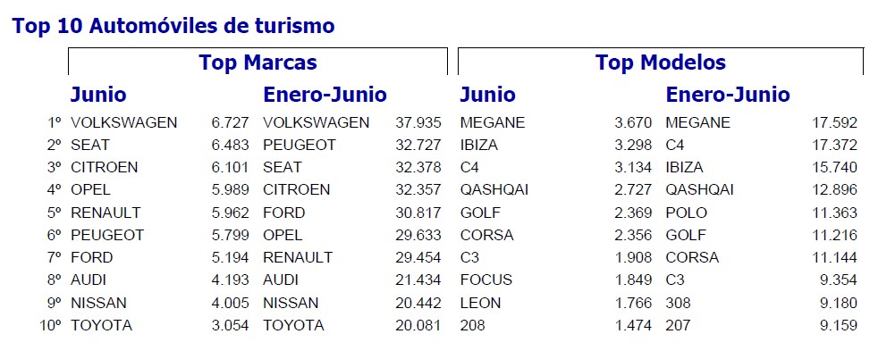 Prácticamente todas las marcas y segmentos de coche han empeorado sus cifras de un año para otro. Wolkswagen se mantiene en cabeza, gracias especialmente al Polo y al Golf; mientras, en lo que respecta a los modelos, son el Renault Megane y el Citröen C4 los superventas. Por tipos de turismo, sólo los micro coches y los todoterrenos pequeño y medianos mejoran algo sus cifras.
