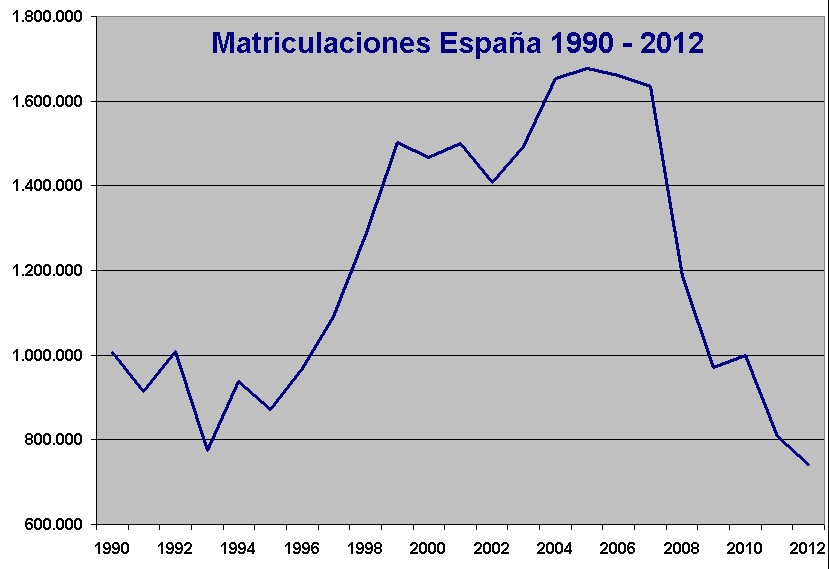 Teniendo en cuenta que la segunda mitad del año suele ser un poco más floja y que la curva descendente se ha intensificado en los últimos meses, podríamos estar hablando de menos de 750.000 unidades vendidas, una cifra que no se recuerda desde comienzos de los ochenta. Por ponerlo en contexto, podríamos destacar que en 1988, se matricularon 1.069.220 turismos, más de 300.000 unidades más, en un país que era mucho más pobre y que tenía 6-7 millones menos de habitantes.
