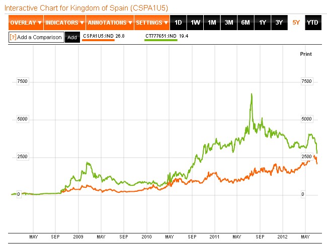 En concreto, según la firma Markit, los CDS de España han igualado este miércoles a los de Irlanda, situados en 498 durante la sesión, algo que no ocurría desde julio de 2010. La siguiente gráfica muestra la evolución de los CDS de ambos países desde 2009 -el último dato es a cierre del martes-, y en él se observa claramente cómo el riesgo de impago irlandés (en verde) ha descendido progresivamente desde mediados de 2011 al tiempo que el de España ha ido en aumento (naranja). Dicho de otro modo, el mercado lleva cerca de un año castigando a la deuda española y premiando a la irlandesa como resultado de las reformas y ajustes efectuados en ambos países -con independencia de los rescates y ayudas internacionales recibidos-.