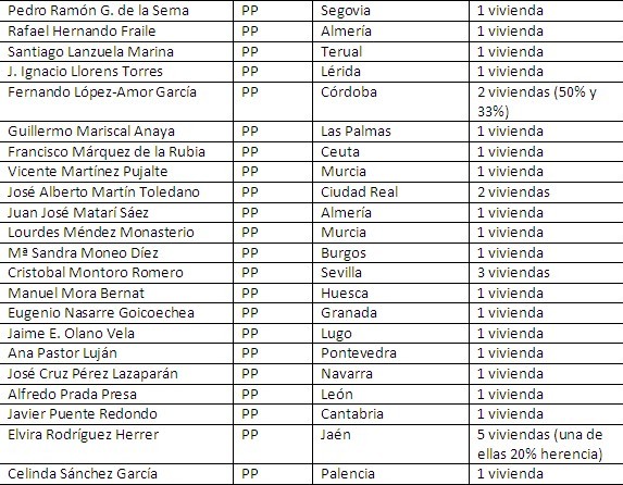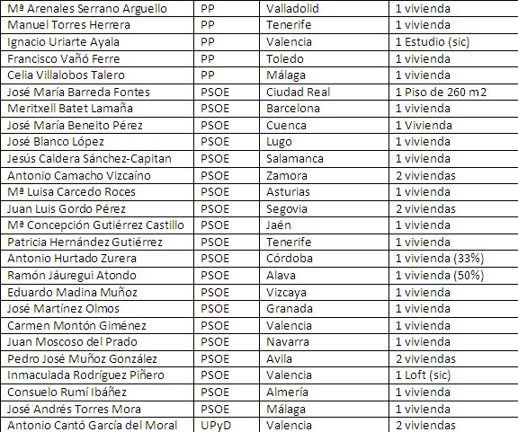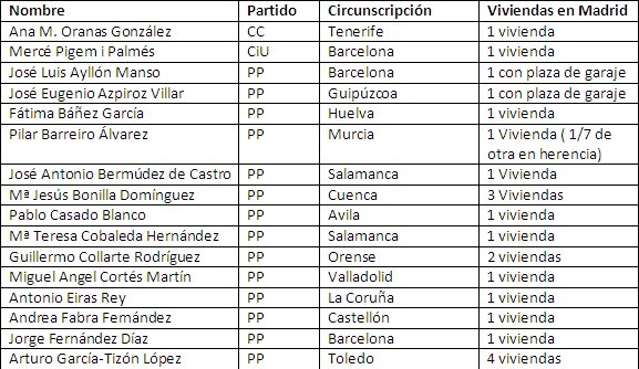 Pues bien, cotejados los datos que los propios parlamentarios elegidos fuera de Madrid aportan en sus declaraciones patrimoniales, resulta que sesenta y cuatro de ellos poseen una o varias viviendas en Madrid, a pesar de lo cual siguen teniendo derecho a esa indemnización mensual de más de 1.800 euros. Destacan los casos de Elvira Rodríguez, diputada por Jaén, que dispone de cinco viviendas en Madrid (una de ellas participada a través de una herencia) y de Arturo García Tizón, diputado electo por Toledo, propietario a su vez de 4 viviendas en la Comunidad de Madrid.