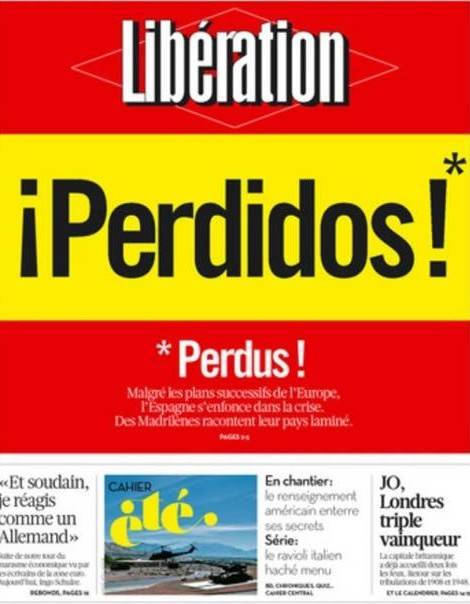 Mientras, "la prima de riesgo se relaja tras nueve días seguidos al alza". Aunque no deben ver mucha relajación al otro lado de los Pirineos. Ni cortos ni perezosos, en la redacción de Libération, han decidido sacar hoy a los kioscos una edición en la que toda la portada es una bandera de España con el titular: "Perdidos". Por si alguno de sus lectores no sabe Español, colocan un asterisco y debajo ponen la traducción al francés "Perdus".