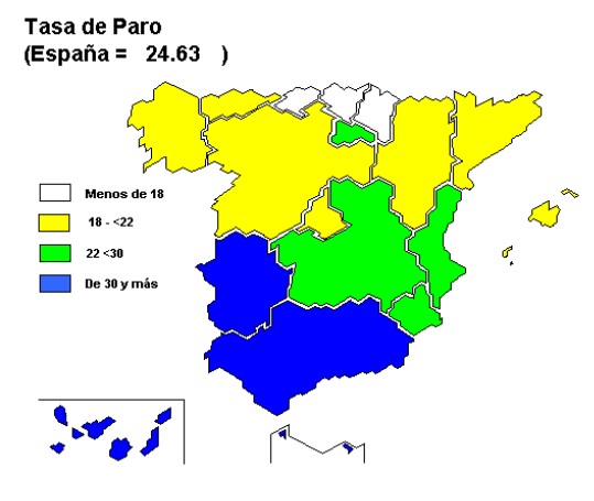 Ya son varias las comunidades autónomas que registran tasas de paro superiores al 30%. Concretamente son Andalucía (33,92%), Canarias (33,14%), Extremadura (33,38%) y las ciudades autónomas Ceuta (39,47%) y Melilla (30,27%). En términos cuantitativos, Andalucía es la Comunidad Autónoma con mayor número de parados 1.362.900 desempleados, seguida de Cataluña (821.600), Valencia (675.500) y Madrid (643.300). En cambio, en cuanto al empleo, Madrid (2.766.800) y Cataluña (2.920.800) son los que más ocupados presentan, cerca de los tres millones.