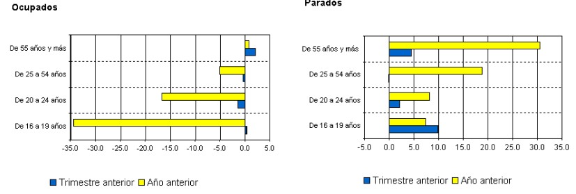 La ocupación aumenta entre los mayores de 54 años en 49.900 personas. Los descensos más acusados del número de ocupados se observan en los hombres de los grupos de edad de 40-44 y 25-29 años (23.700 y 21.900 menos, respectivamente). Entre las mujeres, el grupo de 20-24 años de edad experimenta la mayor bajada (11.500).