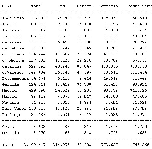 El siguiente cuadro recoge, por comunidades autónomas, el total de empresas activas a 1 de enero de 2012, según su sector económico: