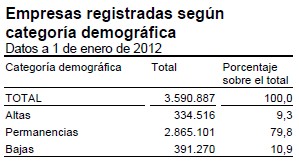 El número de empresas activas disminuyó el 1,6% en 2011 y se situó en 3.199.616, con lo que sumó cuatro años consecutivos de caída, según la última actualización del Directorio Central de Empresas (DIRCE) difundida por el Instituto Nacional de Estadística (INE). Respecto al balance de altas y bajas durante 2011, fueron más las empresas que cesaron su actividad (391.270) que las que se pusieron en marcha (334.516): por lo tanto, podemos decir que desaparecieron un total de 56.754 empresas en términos netos.