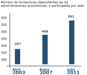 Quizá sea precisamente esa opacidad la que ha hecho que las fundaciones participadas por la administración se multipliquen en nuestro país como setas. En concreto, el número de fundaciones dependientes de las administraciones autonómicas, o participadas por ellas, ha pasado de 357 en abril de 2003, a 498 en enero de 2007 y a 561 en julio de 2011.