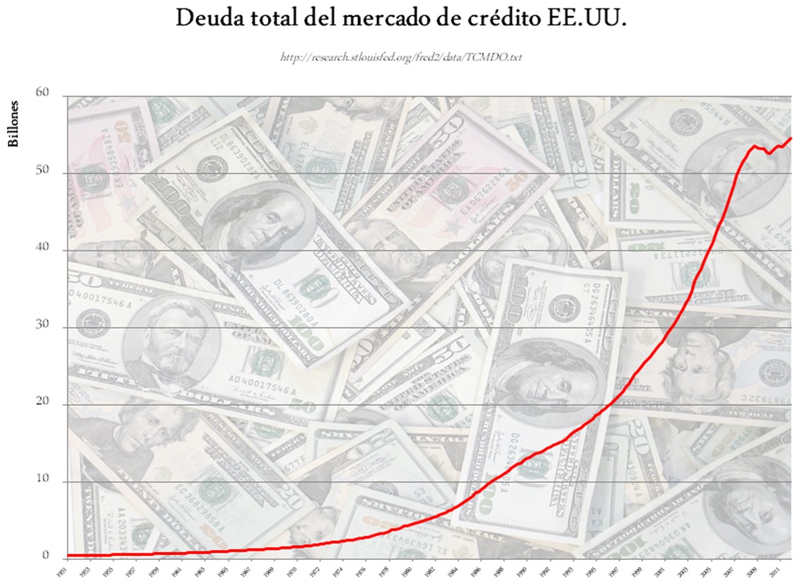 Por si fuera poco, la deuda que han ido acumulando los norteamericanos durante décadas, aunque ha moderado su aumento explosivo, sigue en niveles altísimos. Según Richard Duncan, antiguo miembro del Banco Mundial y economista jefe de Blackhorse Assent Management, la deuda norteamericana ha entrado en una "espiral de la muerte" que podría desembocar en una depresión tan severa que no cree que "nuestra civilización pueda sobrevivir".