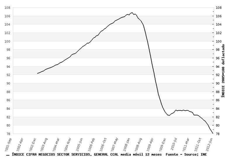 El promedio de caída del indicador deflactado en el segundo trimestre se aproxima al 8%. En estos momentos el sector servicios se desploma un 22% a precios corrientes respecto a 2007 y nada menos que un 29,5% si deflactamos el índice con el IPC. En el primer gráfico se puede apreciar cómo el índice sigue cayendo en estos momentos a ritmos sumamente fuertes.