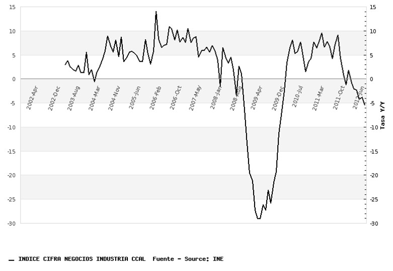 La industria tampoco da tregua, y su índice de cifra de negocios cae un 5,4% en junio sin deflactar, lo que nos lleva a tasas cercanas al 8% una vez deflactado. Es su peor dato desde noviembre de 2009. En el gráfico podemos observar la evolución del índice en tasas de variación interanual y hasta qué punto ha cambiado el panorama del sector en muy pocos meses. En estos momentos la facturación se hunde un 21,2% respecto a máximos de 2007, lo que supone una caída muy similar a la de los servicios.