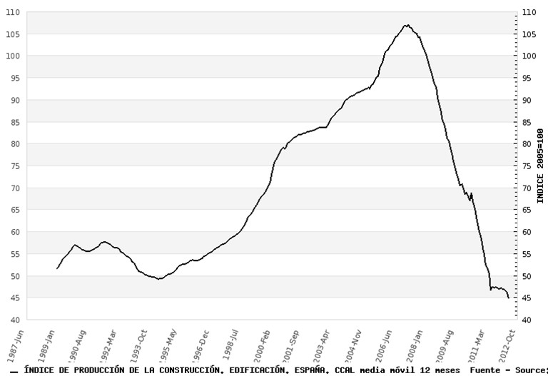 La construcción sufre en mayo -último dato publicado- un auténtico batacazo, ya que su índice de producción se hunde hasta la peor cifra de la serie histórica (35,5), siendo el descenso interanual del 24,8%. La caída respecto al mejor mayo (2006) es del 63,9%. Esto se explica, básicamente, por el desplome en la licitación de obra pública.