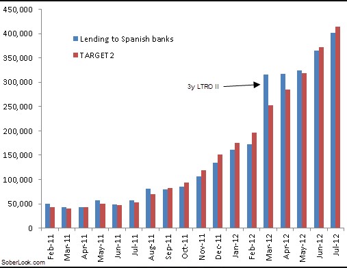 Las peticiones de la banca española al BCE supone el 32% del total solicitado por las entidades, lo que triplica el peso que las entidades españolas tienen, en función de sus activos y de sus pasivos, en el conjunto de la banca europea, que es del 10%. Durante el verano de 2010 las peticiones de las entidades financieras españolas se dispararon hasta alcanzar un máximo de 131.891 millones de euros en julio. A partir de entonces, y hasta mediados de 2011, la tendencia fue moderadamente bajista, pero a partir de mayo del año pasado las crecientes dificultades de la banca española para acceder al crédito por la desconfianza de los mercados hacia España se han dejado notar cada vez más en la dependencia de la banca española frente al BCE.