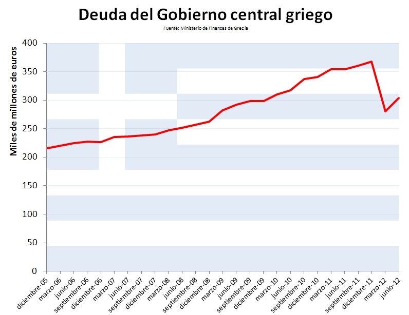Grecia cerró el año pasado con una deuda pública récord de 368.000 millones. Durante el primer trimestre de 2012, consiguió una reducción sin precedentes, hasta situarse en los 280.000 millones. Pero, con los datos aportados el viernes, Grecia vuelve a situarse en su senda habitual de acumulación de deuda pública.