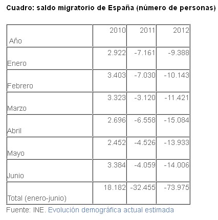 Tal y como avanzó Libre Mercado, España vuelve a ser un país de emigrantes, ya que en 2011, por primera vez en una década, se registró un saldo migratorio negativo, es decir, se fueron más personas de las que llegaron. Y esta evolución se está acelerando en los últimos meses. Los datos del INE arrojan un saldo migratorio negativo de 73.975 personas (entre nacionales y extranjeros) en el primer semestre de 2012 frente a los 32.455 registrados en el mismo período del pasado año, lo cual implica un aumento del 128% interanual.