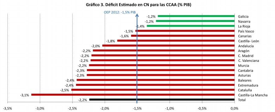 El estudio señala que, en el supuesto de que las CCAA sean capaces de implementar al 100% las medidas anunciadas en sus PEF, el déficit estimado para el año 2012 se situaría en el 2,2% PIB, siendo la desviación respecto al Objetivo de Estabilidad Presupuestaria (OEP) de -0,7% PIB (es decir, un 50% superior al objetivo). Solamente tres comunidades cumplirían el OEP (Galicia, Navarra y La Rioja). Las CCAA que más se desviarían de su objetivo serían Castilla La-Mancha y Cataluña. En el caso de que las Comunidades no tomasen las medidas anunciadas en sus PEF, su déficit se elevaría hasta alcanzar el 4% PIB (un 166% superior al objetivo del 1,5%).