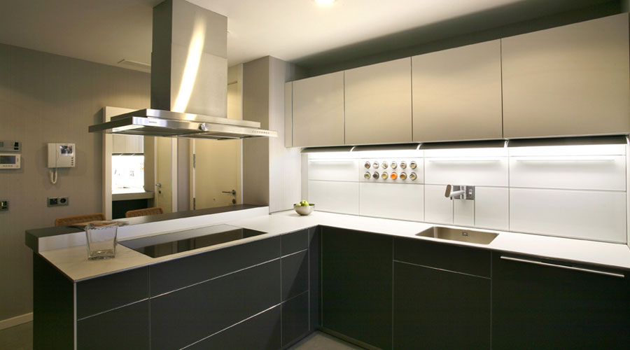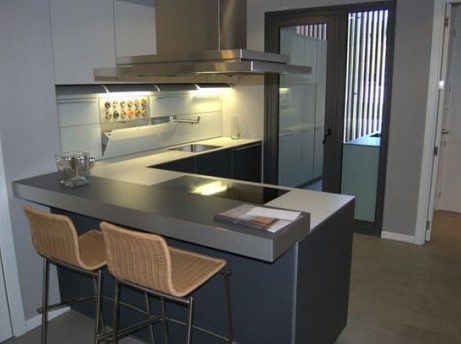 El mobiliario de la cocina y el tendedero están acabados en laminados combinando los colores blanco caolín y gris antracita.