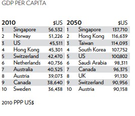 Singapur ocupa actualmente el primer puesto de las naciones más ricas por PIB per cápita, con 56.532 dólares (45.778 euros) en 2010, por delante de Noruega, Estados Unidos, Hong Kong o Suiza, según un informe de Wealth Report elaborado por Knight Frank y Citi Private Wealth. En 1960, el ingreso per cápita era de 428 dólares. El informe prevé que en 2050 Singapur seguirá encabezando la lista de los países con mayor renta.