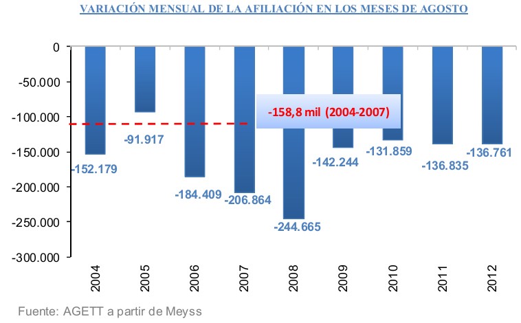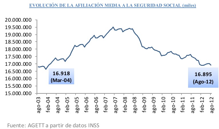 La Seguridad Social, por su parte, perdió 604.541 afiliados en los últimos doce meses, lo cual equivale a un descenso del 3,45% interanual, más que duplicando las caídas registradas en agosto de 2011 (-1,22%) y 2010 (-1,58%) y el mayor retroceso en ese mismo mes desde 2009, cuando el número de cotizantes cayó en más de 1,1 millones (-5,94%).