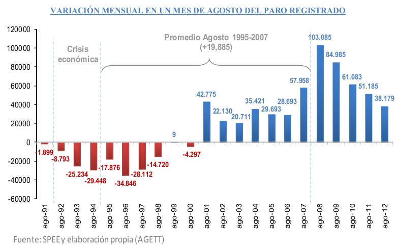 Ambas cifras no son del todo malas si se tiene en cuenta que agosto es un mes en el que tradicionalmente se destruye empleo como resultado de la finalización de muchos contratos de carácter estacional ligados a las actividades propias de la temporada estival en el sector servicios. Desde este punto de vista, se puede señalar que el mercado laboral durante el pasado agosto se ha comportado de una forma relativamente normal en comparación con otros años, lo cual es digno de destacar en el actual contexto recesivo.