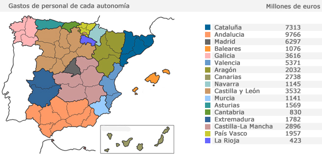 La tabla siguiente muestra cuánto gasta cada autonomía en personal (funcionarios, contratados laborales, altos cargos, ...). Como vemos, el gasto total de personal de las 17 autonomías en un solo año supera el agujero completo de nuestro sistema bancario.