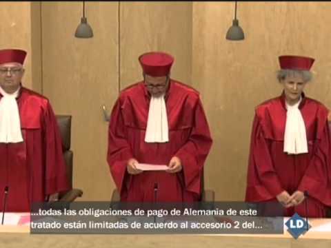 "En nombre del pueblo: las quejas contra el Mecanismo Europeo de Estabilidad y el pacto fiscal son rechazadas, basadas en la ratificación del tratado, que sólo puede surtir efecto si es asegurado conforme a la ley internacional que uno, la resolución del artículo 8, párrafo 5, sentencia 1 del tratado en cuanto al Mecanismo Europeo de Estabilidad, todas las obligaciones de pago de Alemania de este tratado está limitadas de acuerdo al accesorio 2 del tratado. Ninguna prescripción del tratado debe ser interpretada del modo que causaría obligaciones de pago más alas por parte de Alemania son el consentimiento del portavoz alemán".