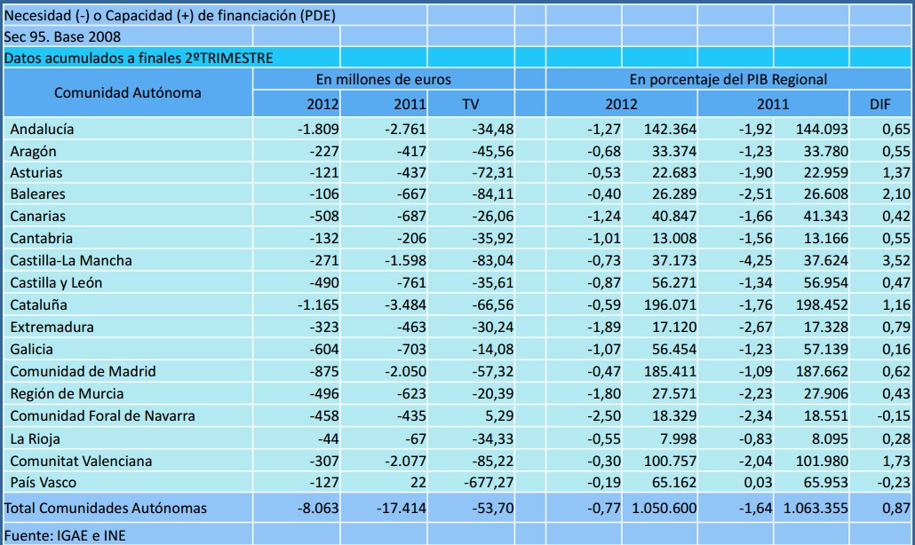 Seis comunidades, en términos homogéneos, han logrado un déficit muy por debajo del 0,75%, que es la mitad del marcado para todo el año 2012 (el 1,5% del PIB). Estas regiones son Aragón (0,68%), Asturias (0,53%), Baleares (0,40%), Madrid (0,47%), La Rioja (0,55%) y País Vasco (0,19%).