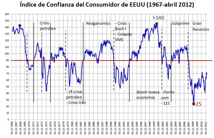 Desligar el sentimiento o la psicología del consumidor de factores reales de la economía es algo que poco tiene que ver con la realidad. La psicología es muy puñetera y nos hace descontar escenarios anormalmente positivos y negativos en momentos históricos distintos, pero estos augurios están impulsados, respectivamente, por un auge y deterioro de las cuentas de los agentes económicos que es innegable. Otra cuestión es cómo de sostenibles sean esos escenarios. Y ahí es donde entran en juego los "excesos". Por eso nos solemos topar con los archiconocidos ciclos económicos entremezclados con la lógica linealidad de la historia (tendencias seculares y experiencias únicas de cada época histórica).