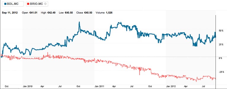 La noche y el día... Mientras que una compra de acciones de Barón de Ley realizada tres años atrás nos permitiría disfrutar de una jugosa rentabilidad próxima al 40%, la misma compra de acciones de la competidora Bodegas Riojanas nos habría conducido a rentabilidades similares, pero negativas: la acción de BRIO se ha dejado casi un 40% por el camino.