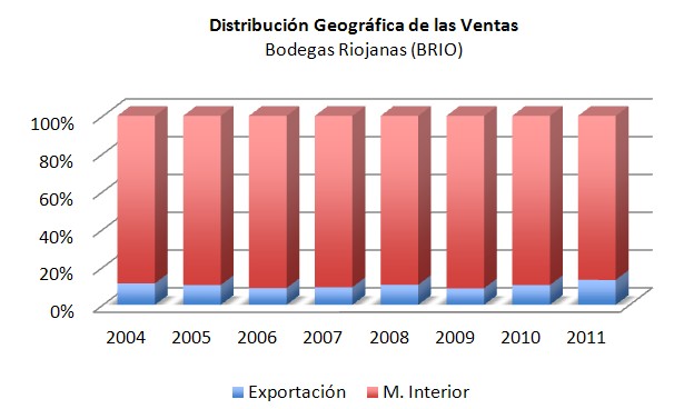 Empecemos por Bodegas Riojanas. Ésta es la evolución de la distribución geográfica de su negocio desde el año 2004: