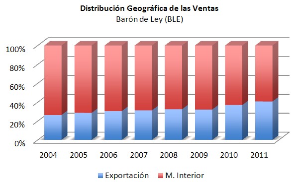 Vayamos ahora a por Barón de Ley. El gráfico habla por sí sólo. En 2004, la facturación de Barón de Ley en el exterior superaba ya el 26% de las ventas totales. En 2011, la cifra de negocio fuera del Reino de España superó, por primera vez, el umbral del 40%. Estamos pues, ante dos formas de entender el negocio: una, con clara vocación nacional; y otra, con una apuesta decidida por la internacionalización de sus ventas.
