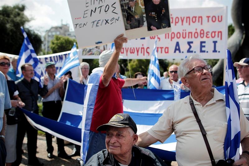Giorgos Labrakos, un veterano de la II Guerra Mundial de 99 años, participa en una protesta contra las medidas de austeridad y las reformas acometidas por el gobierno, frente al Parlamento en Atenas.