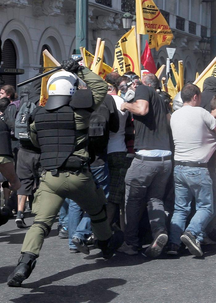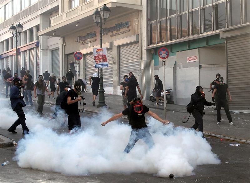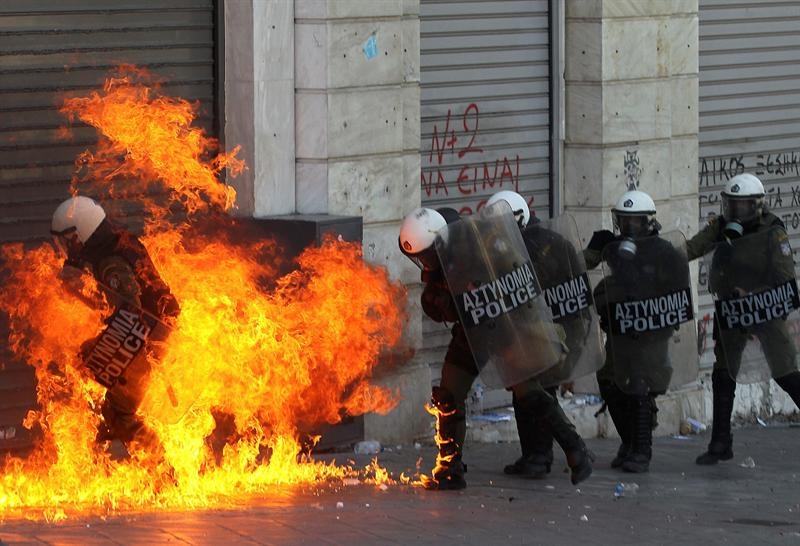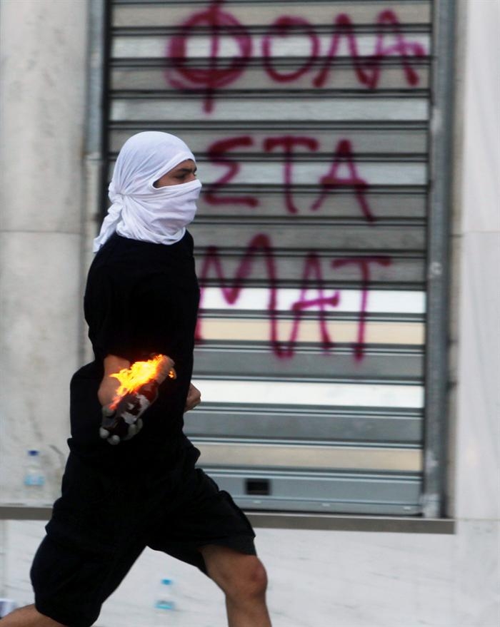 Un manifestante griego se dispone a lanzar contra los policías antidisturbios un cóctel molotov durante los choques violentos de la manifestación.
