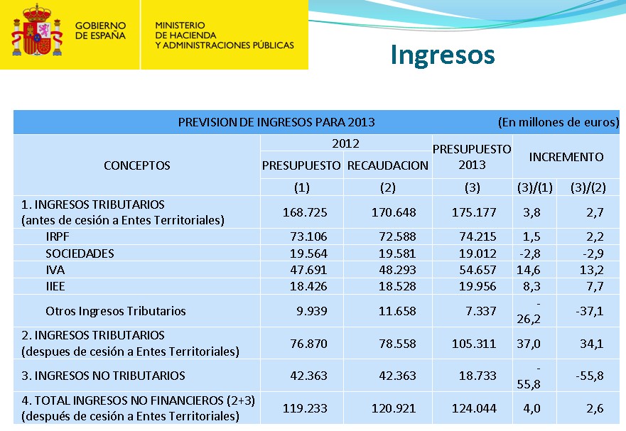 De este modo, la partida de ingresos no financieros se situará en 124.044 millones de euros frente a los 119.233 millones del pasado año, es decir, un 4% más a nivel interanual. El Gobierno pretende recaudar en total 4.811 millones de euros más que en 2012. Y ello, en medio de una recesión económica.