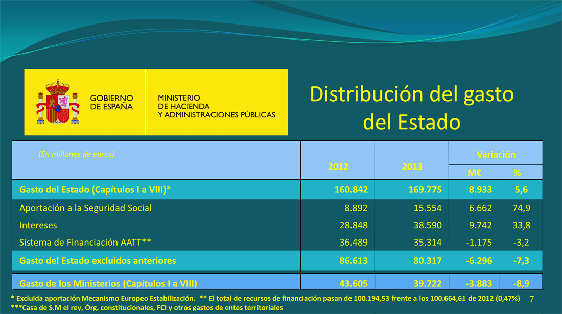 En materia de gastos, los PGE reflejan que el Estado gastará en 2013 más que en 2012. El gasto total de la Administración Central (sin contar el capítulo IX, en el que se incluyen los vencimientos de la deuda) subirá un 5,6% respecto a 2012, de 160.842 a 169.775 millones -casi 9.000 millones más-. El Gobierno destaca el recorte en el gasto de los ministerios, que cae un 8,9% interanual, de los 43.605 a los 39.722 millones.