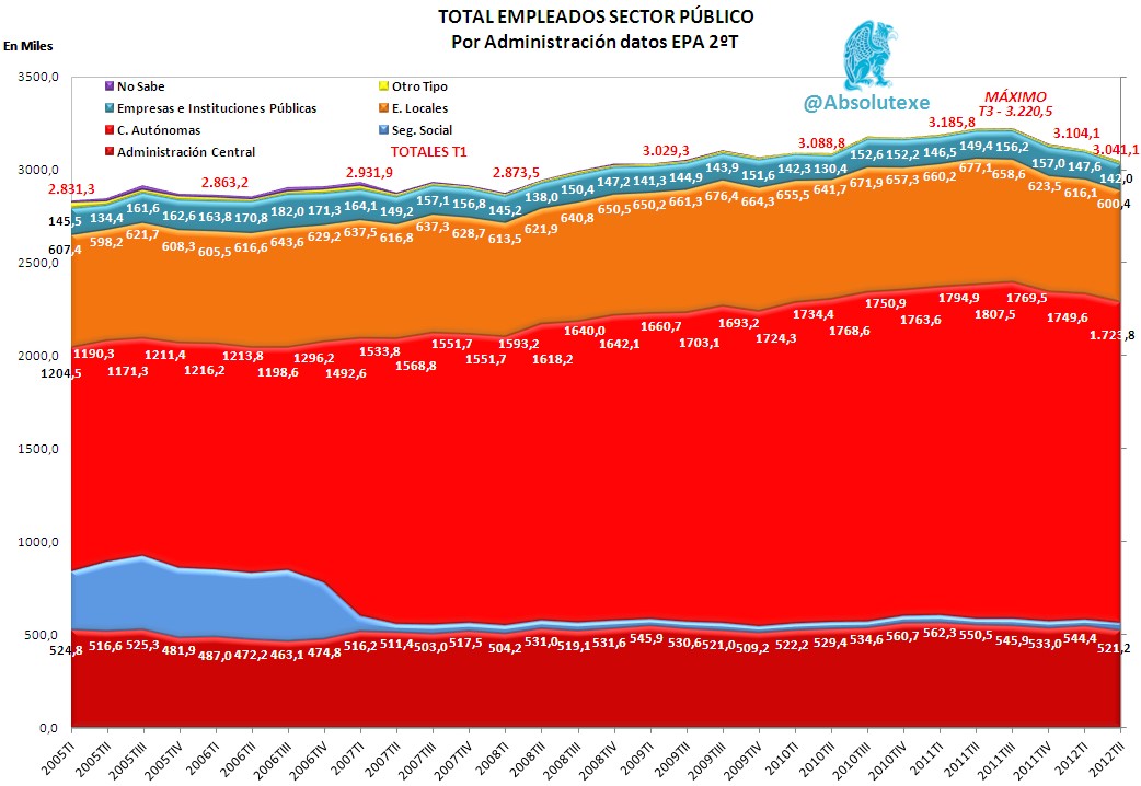 España cuenta con cerca de 3,04 millones de empleados públicos, según la Encuesta de Población Activa (EPA) del segundo trimestre, apenas 180.000 menos que a mediados de 2011, cuando alcanzó su máximo histórico. De esta cifra, cerca de 1,6 millones son funcionarios y, por tanto, tienen su puesto garantizado de por vida.