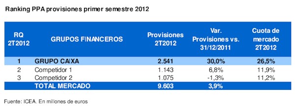 Durante el primer semestre de 2012, VidaCaixa ha afianzado su liderazgo en el ranking de pensiones individuales (PPI) y PPA, gestionando un volumen de ahorro de 9.299 millones de euros entre PPI y PPA con una cuota de mercado del 15,6%.