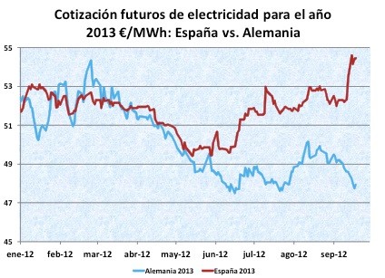 La mayor parte de esta subida fiscal, a excepción de la que afecta a las renovables -ya que cobran una tarifa fija establecida por ley-, se trasladará al precio de la luz. Y esto es, precisamente, lo que ha empezado a descontar el mercado energético. Así, entre junio de 2011 y junio de 2012, los precios de los futuros de electricidad fueron, en promedio, un 2,8% más baratos en España que en Alemania.