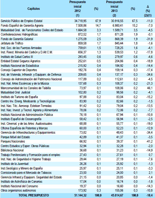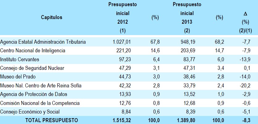 Consejo General del Poder Judicial: su presupuesto sufre un ajuste del 12 por ciento hasta situarse en 62,78 millones de euros. Este tijeretazo llega tras la polémica suscitada por los viajes de largos fines de semana efectuados por el expresidente del órgano de gobierno de los jueves Carlos Dívar, cuyos gastos se cargaron en parte a esta institución. Dívar terminó dimitiendo.