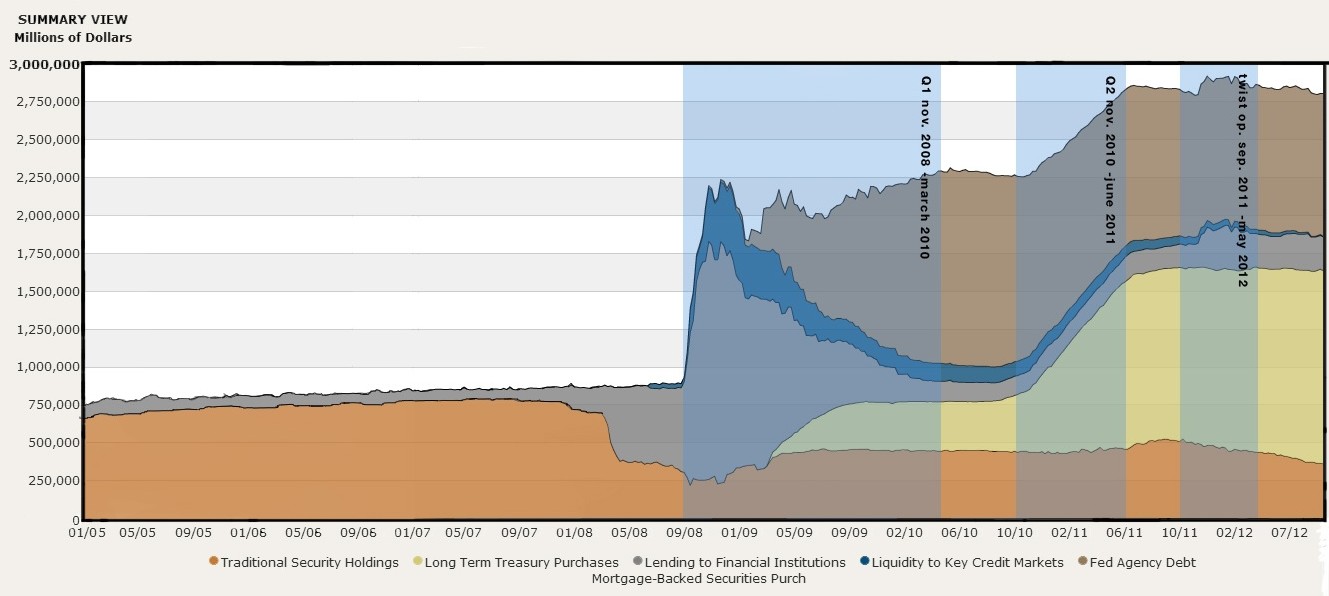 Antes del estallido de la crisis, el balance de la Reserva Federal se situaba en poco menos de un billón de dólares. Desde enero de 2005 a octubre de 2008, su balance había aumentado de 750.000 millones a cerca de 950.000 millones de dólares. En ese período, aumentó a un ritmo de 4.348 millones al mes. Asimismo, la M2 (papel moneda, más cuentas bancarias depositadas en la Reserva Federal, más cuentas corrientes, más cuentas de ahorro, más cuentas de certificados de depósito de menos de 100.000 dólares) creció de 6,4 billones de dólares a 8 billones.