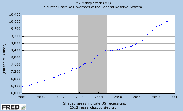 Desde noviembre de 2008 a septiembre de 2012, la M2 en EEUU ha pasado de 8 billones de dólares a 10,1 billones de dólares, de forma que la masa monetaria ha aumentado 0,5 billones más con respecto al período que va de 2005 a noviembre de 2008 -en plena expansión crediticia-. Y ello, pese a la brutal crisis financiera acontecida durante esta etapa, caracterizada por la contracción del crédito, la devaluación de activos y las quiebras e impagos generalizados en el sector financiero.
