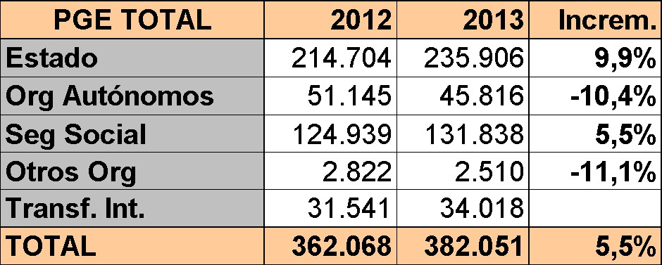 Curiosamente, las cuentas del Estado para 2013 han sido criticadas precisamente por su falta de control en el gasto. A pesar de las palabras de Montoro, lo cierto es que la cifra total ha pasado de 362.066 a más de 382.000 millones. Son 20.000 millones de euros de diferencia (casi un 2% del PIB), lo que supone un incremento del 5,5% respecto a 2012.