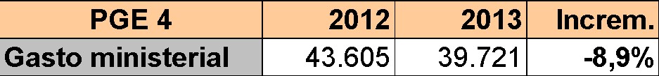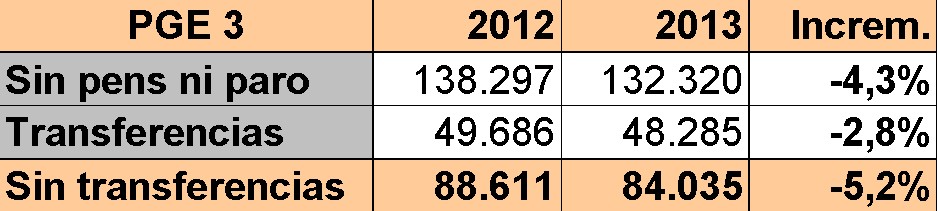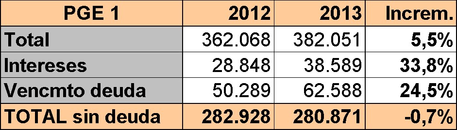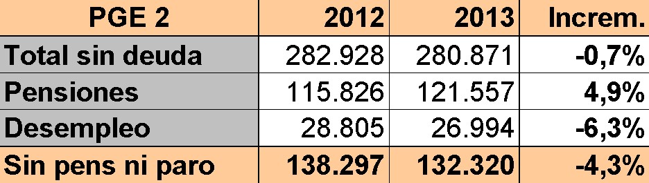 Es un incremento difícil de asumir. Pero incluso quitando estas dos líneas, no es fácil encontrar la austeridad. Como puede verse en el siguiente cuadro, el gasto total sin contar la deuda apenas caerá un 0,7% en 2013.