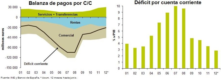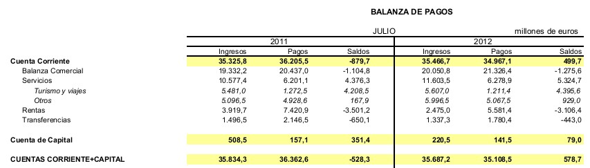 De este modo, en los primeros siete meses de 2012, la balanza por cuenta corriente acumuló un déficit de 17.383 millones de euros, muy inferior a los 25.451,2 millones del mismo período de 2011. Pero lo relevante no radica tanto en el volumen acumulado a lo largo del año sino en el dato concreto de julio, ya que registró un superávit por cuenta corriente de 499 millones de euros por primera vez desde los años 90.
